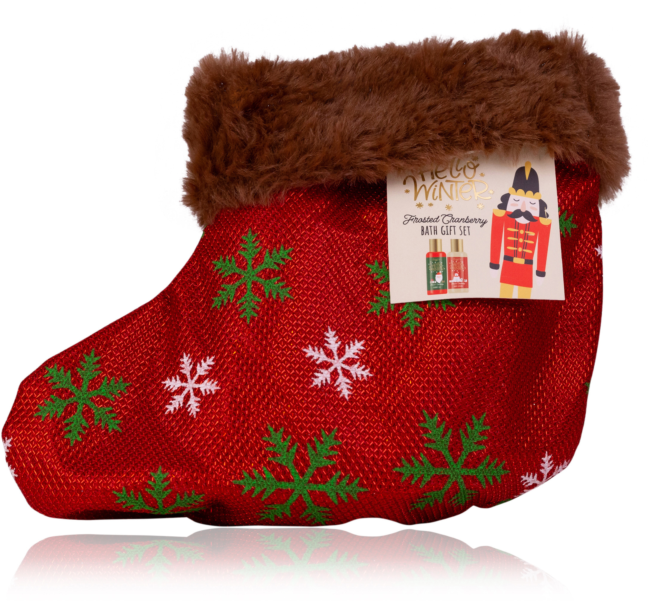 Badeset HELLO WINTER in Weihnachtsstrumpf, inkl. 100ml Duschgel, 100ml Bodylotion, Duft: Frosted Cranberry, Farbe: creme/rot/grün, VE 6/24