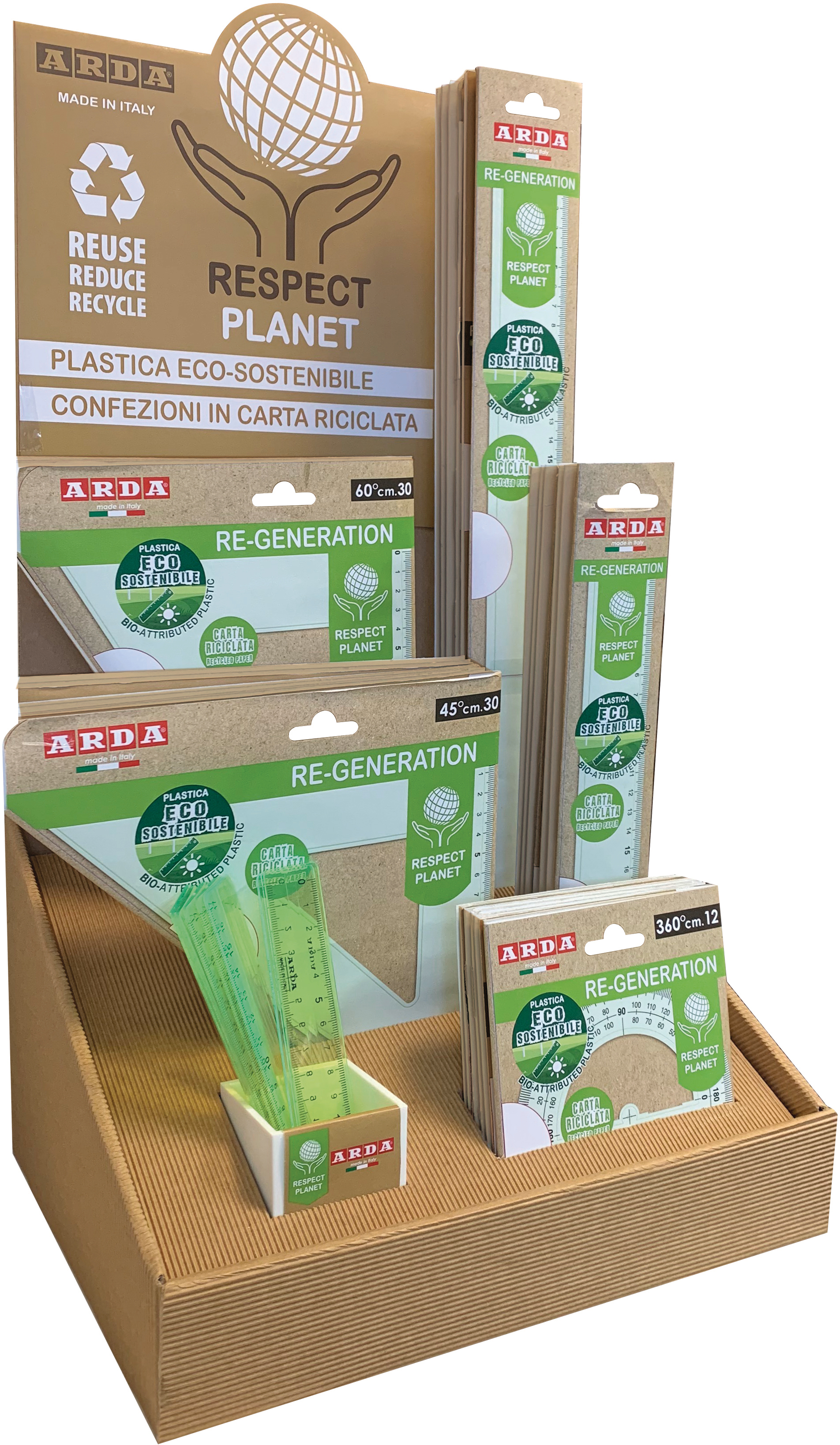 Re-Generation Display mit Produkten für technisches Zeichnen auf A3-Papier. Material aus biologisch abbaubarem Kunststoff. 100% recycelbar. Verpackung aus Recycling-Papier. Geeignet für die Schule, das Büro und für die Verwendung zu Hause.
