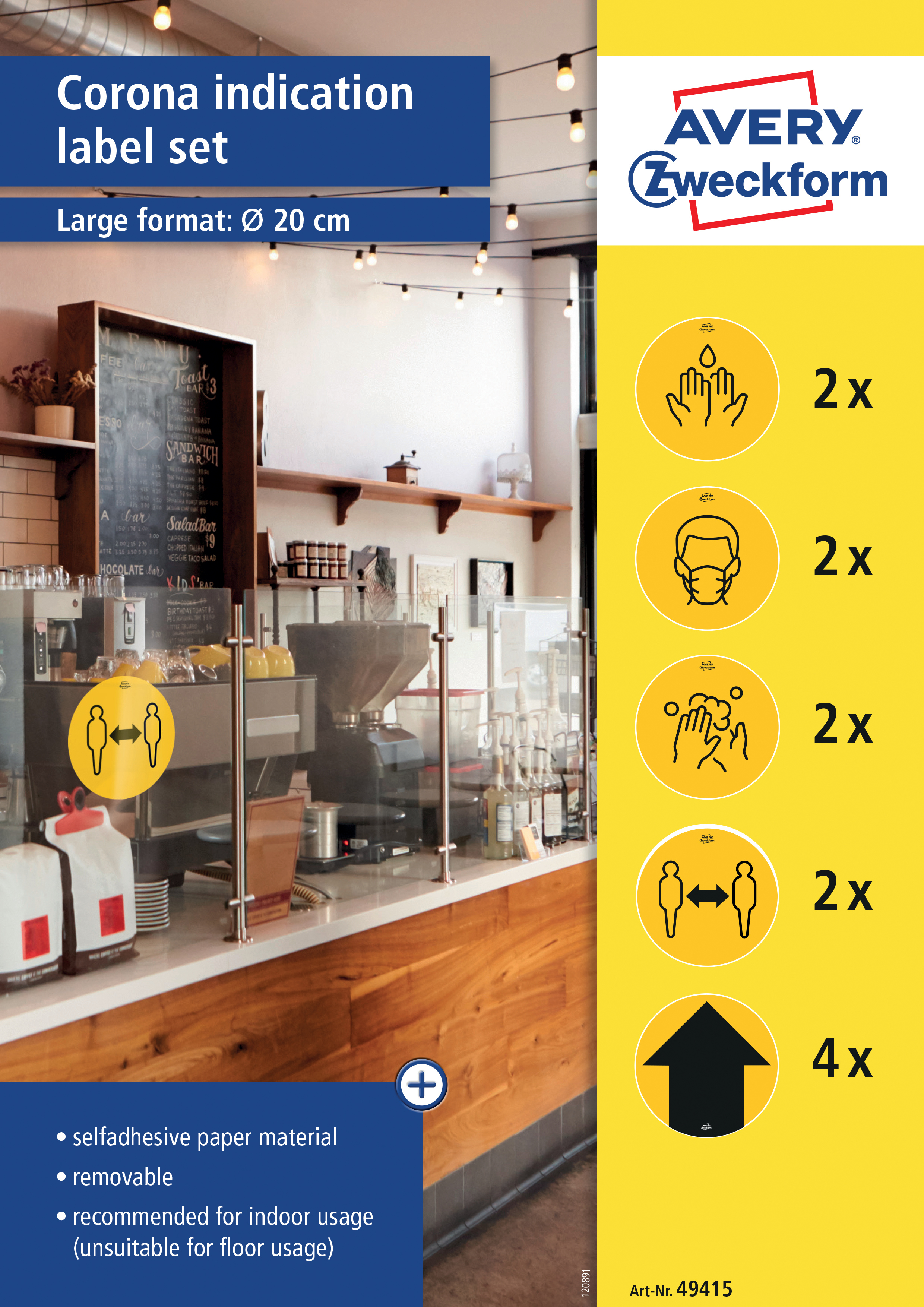 - 12 selbstklebende Papieretiketten mit Piktogramme ohne Text (Händewaschen, Abstand halten, Mundschutz, Hände desinfizieren, Pfeil)