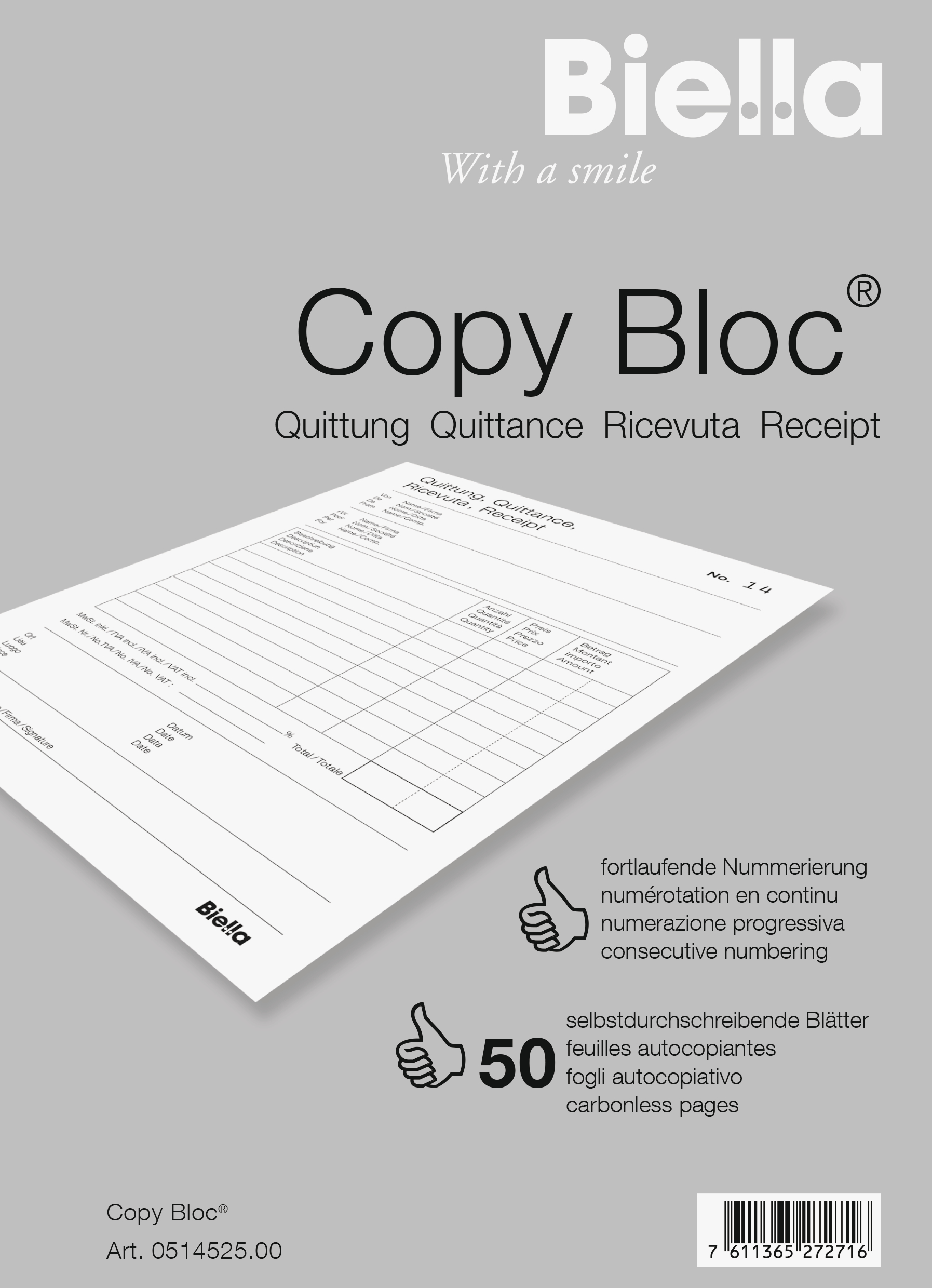 Produktinformationen "BIELLA Quittung COPY-BLOC D/F/I/E A5 51452500U selbstdurchschreib. 50x2 Blatt"