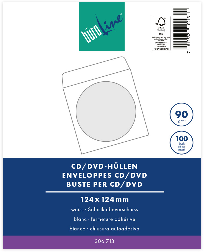 BÜROLINE CD/DVD-Hüllen 124x124mm 107955 weiss, 90g 100 Stück