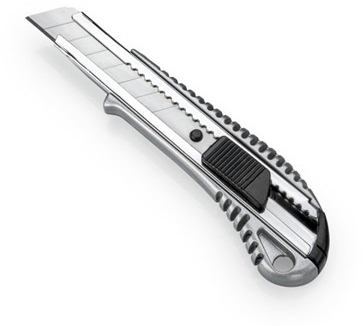 Profi Cuttermesser mit Metallgehäuse und 18 mm Klinge. Formschöne Cutter für saubere Schnittflächen und glatte Kanten. Das vielseitige Werkzeug für den Profi. Die Standard-Abbrechklinge, aus rostfreiem Stahl, kann mittels Rasterautomatik vorgeschoben werden. Die Metallführung der Schneidklinge sorgt für Sicherheit im Handling und garantiert einen exakten Schnitt. Eine Abbrechhilfe ist im Verschlussteil der hinteren Messerzuführung integriert. Ergonomisch geformter Griff aus Metall mit Rippenstruktur für sicheren Halt. Lieferung mit eingesetzter Klinge auf SB-Karte