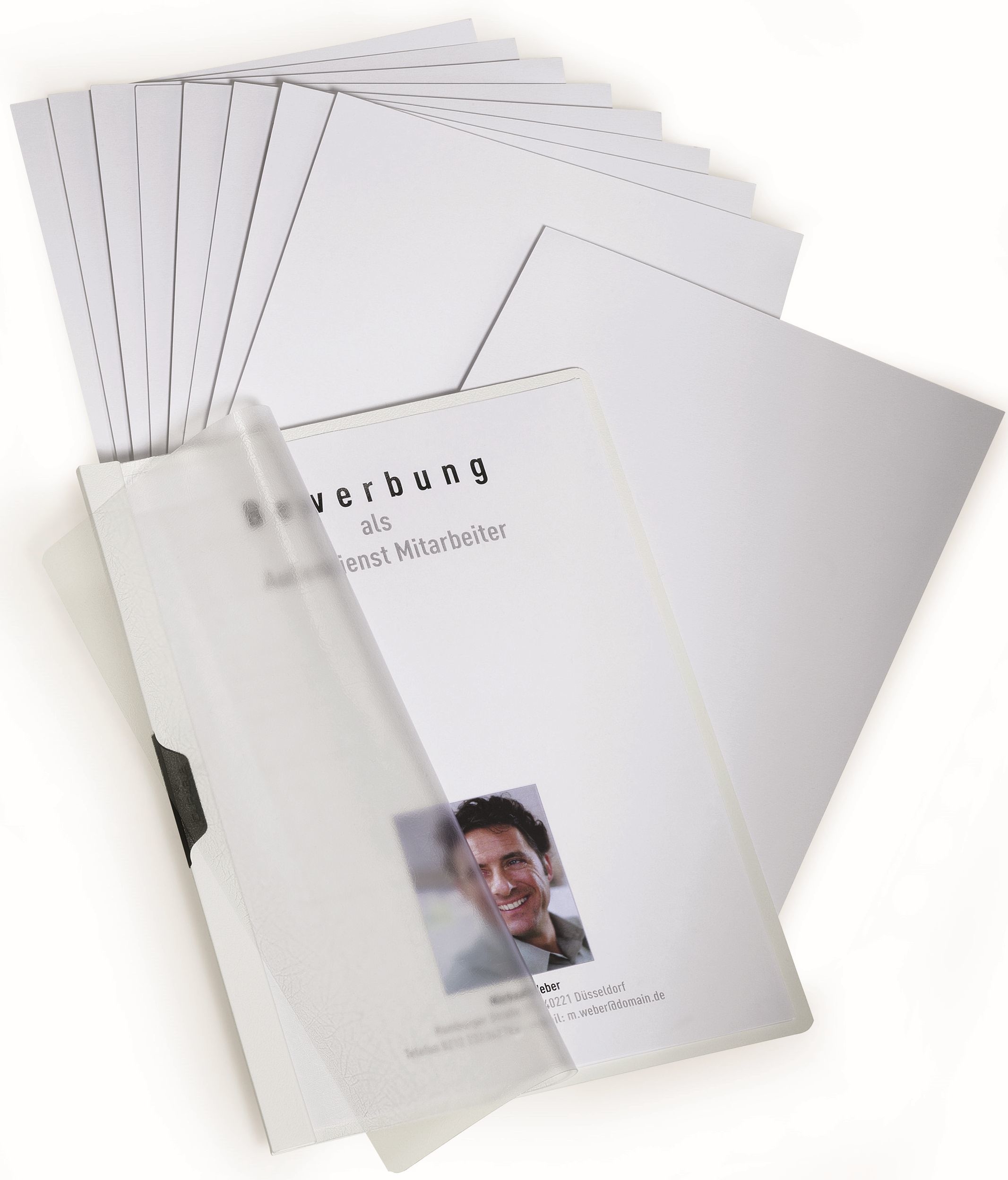 Die beliebten Durable Klemmhefter Duraclip 30 sind nun auch im Bewerbungs-Set erhältlich. Die Klemmhefter fassen bis zu 30 Blatt und das ohne die Dokumente lochen zu müssen. Die A4 Mappe ist einfach in der Anwendung und schützt Ihre Unterlagen optimal. Im Set sind 3 Durable Klemmhefter, 9 Blätter, 4 Adressetiketten und eine Bewerbungsbrochüre enthalten. So sind Sie optimal für die nächste Bewerbung ausgestattet.