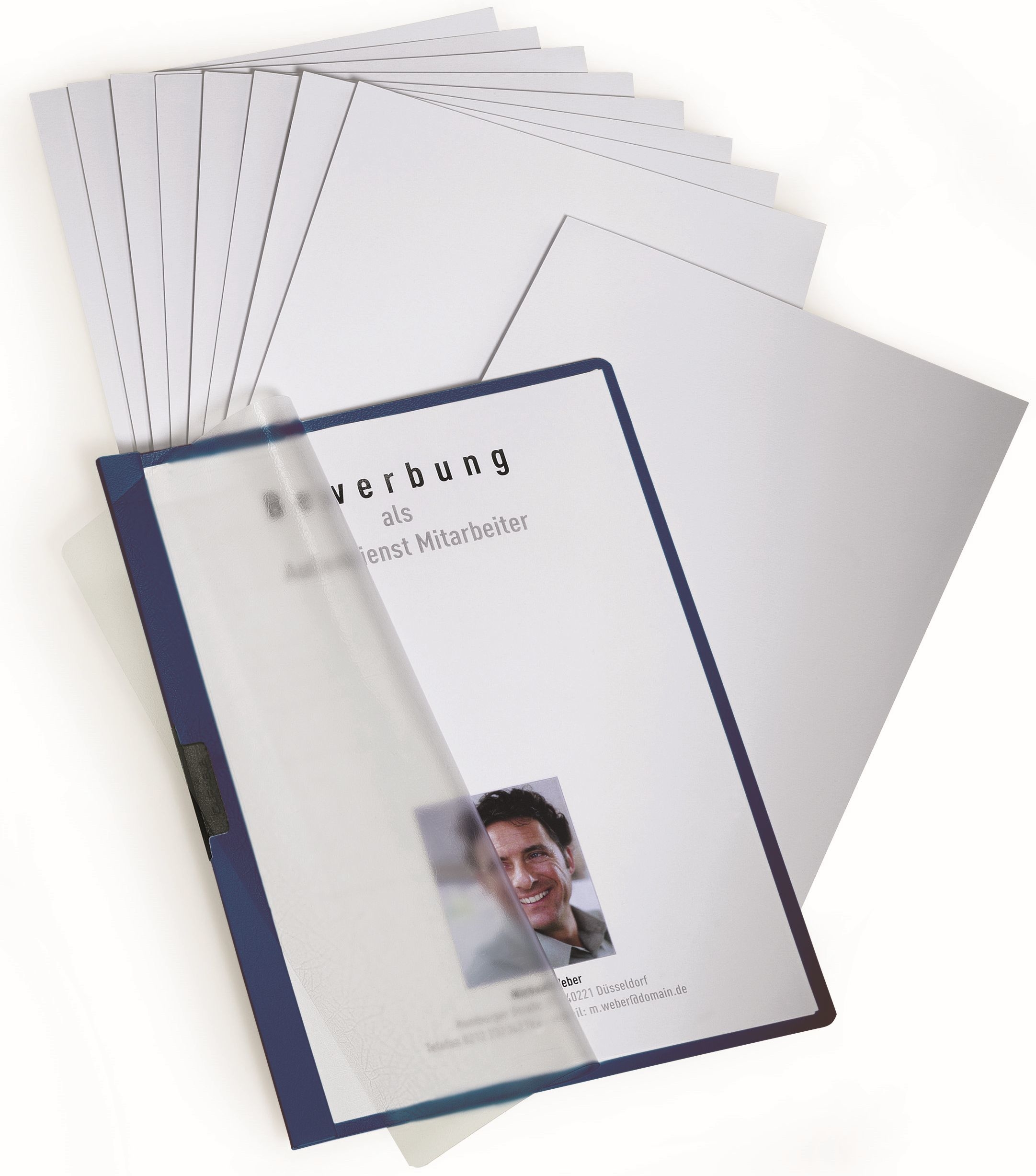 Die beliebten Durable Klemmhefter Duraclip 30 sind nun auch im Bewerbungs-Set erhältlich. Die Klemmhefter fassen bis zu 30 Blatt und das ohne die Dokumente lochen zu müssen. Die A4 Mappe ist einfach in der Anwendung und schützt Ihre Unterlagen optimal. Im Set sind 3 Durable Klemmhefter, 9 Blätter, 4 Adressetiketten und eine Bewerbungsbrochüre enthalten. So sind Sie optimal für die nächste Bewerbung ausgestattet.