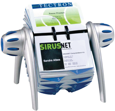 Flexible Rollkartei mit doppelseitigen Hüllen für Visitenkarten bis 104x72mm. 25-teiliges Register A-Z. Die Karten bleiben durch den Drehmechanismus an jeder gewünschten Position stehen.
