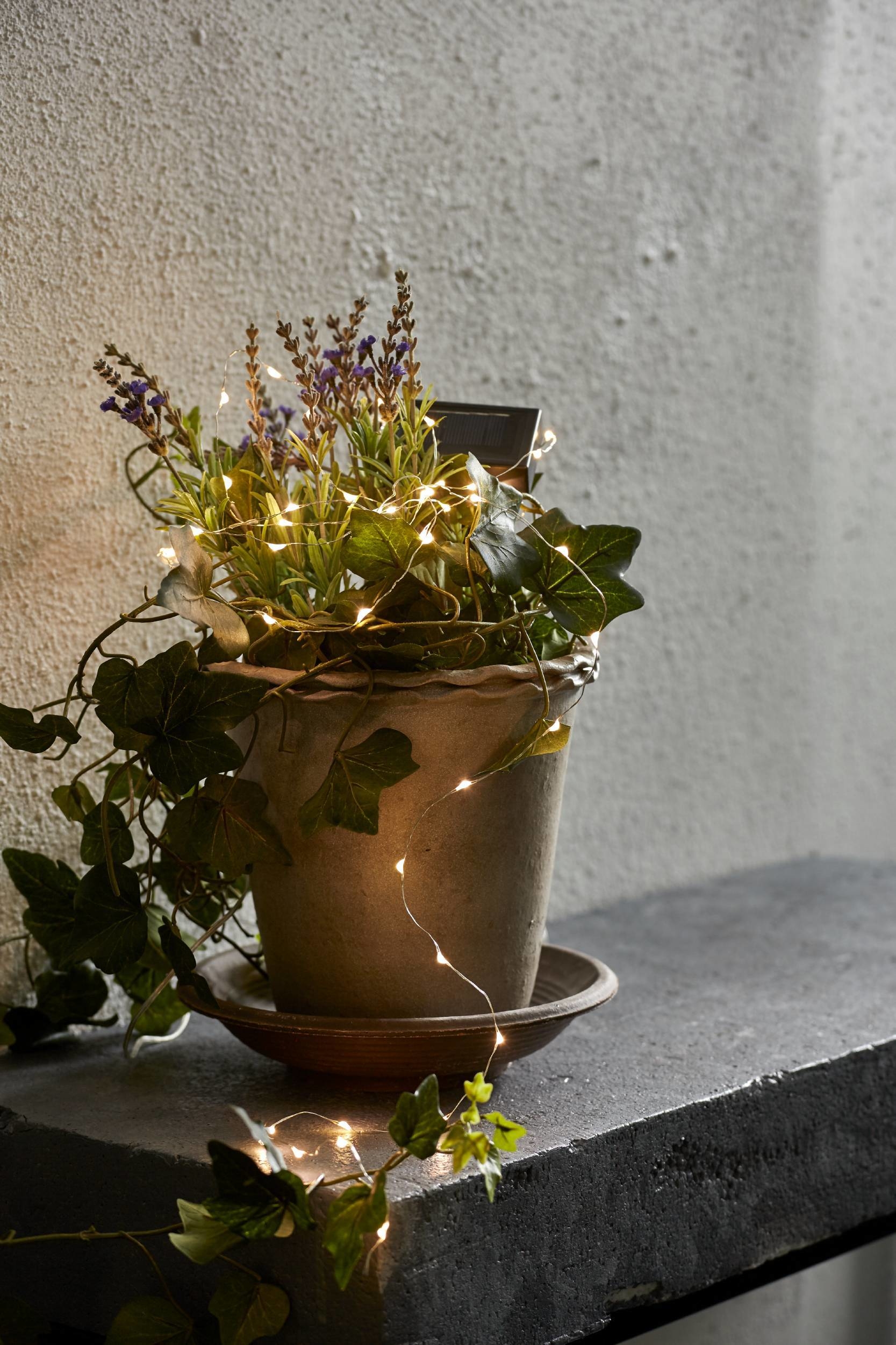 Die LED - Solarlichterkette wird aus Kunststoff gerfertigt. Die Gesamtläng beträgt 5m. Der Akku der Leuchte ist bereits integriert und hält bei voller Ladung ca. 6h.