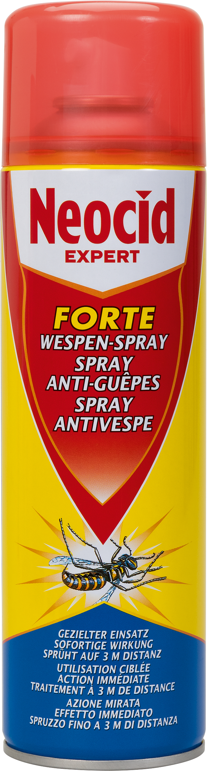 Der Neocid Expert Forte Wespen-Spray wirkt sowohl sofort wie auch präventiv als Langzeitschutz gegen Wespen, Hornissen und deren Nester. Das Spezialventil ermöglicht eine sichere Handhabung aus einer Distanz von 3 Metern.