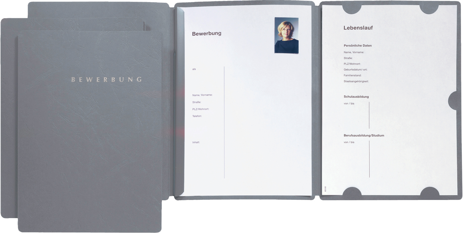 Aus durchgefäbtem Karton mit strukturierter Oberfläche und silbernem Schriftzug BEWERBUNG auf dem Vorderdeckel, 3 Klappen, Halbmondstanzungen, 1 Klemmschiene.
