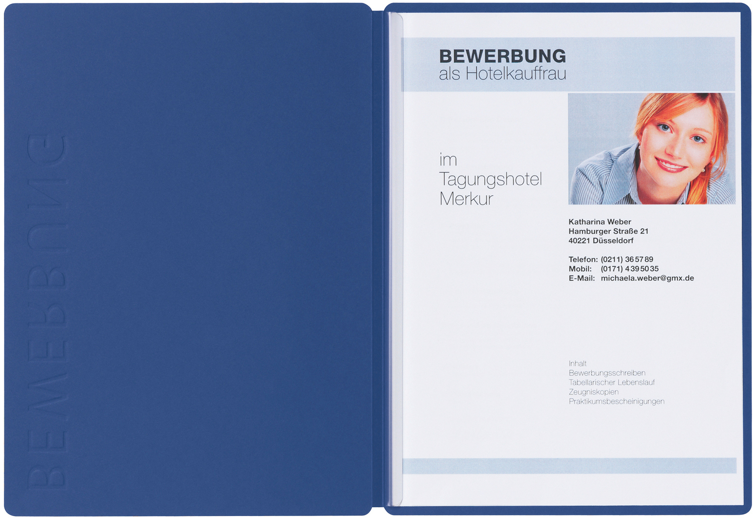 Bewerbungsmappe Solo, für Dokumente im Format A4, Classic, 2-teilig, blau, aus hochwertigem Karton, mit stabiler Klemmschiene, erhabener Prägung „Bewerbung“ auf dem Vorderdeckel