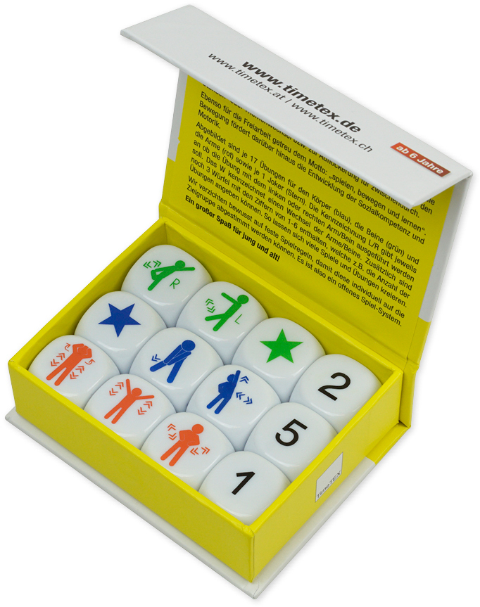 Insgesamt 12 sechsseitige Würfel mit denen Bewegung in den Unterricht kommt, weil sie sich hervorragend für den Stundenwechsel, zur Auflockerung des Unterrichts oder zur Steigerung der Konzentrationsfähigkeit eignen. Ebenso gut lassen sich die Würfel als kleines Spiel für zwischendurch oder im Sport-Unterricht einsetzen. Je nach Jahrgangsstufe würfeln die Schüler mit einem oder mehreren Würfeln, womit auch anspruchsvollere Aufgaben gebildet werden können. Zur leichteren optischen Unterscheidung sind die Würfel für Übungen der Arme (rot), Beine (grün) und des Körpers (blau) pro Version unterschiedlich farbig gestaltet. Mit dieser optischen Unterscheidung ist eine schnelle Auswahl und punktgenaue Aufgabenstellung möglich. Die Würfel werden in einer praktischen Box geliefert, die farbigen Piktogramme sind auf den weissen Würfeln besonders gut zu erkennen. Aus den oben liegenden Würfelfeldern wird eine Übungsaufgabe gebildet. Hierbei kann es sich, je nach Auswahl und Anzahl der Würfel, um Übungen für die Arme, Beine oder des Körpers handeln.  In Kombination mit den Ziffern-Würfeln kann die Anzahl der jeweiligen Übung bestimmt werden.  Das Würfel-Set ist für alle Altersgruppen von jung bis alt gut einsetzbar. Der Schwierigkeitsgrad kann verändert werden, indem man die Anzahl der Würfel erhöht und reduziert. Neben Übungen für die ganze Klasse auch für Einzel-, Paar- oder Gruppenarbeit oder zur Beschäftigung von einzelnen Schülern geeignet. Eine Anleitung auf der Deckel-Innenseite informiert über vielfältige Einsatzmöglichkeiten. Die Würfel sind in einer sehr schönen, robusten und haptisch angenehmen Klapp-Box aus Pappe mit Magnet-Verschluss untergebracht. Dadurch lässt sich die Klapp-Box leicht öffnen/schliessen und die Handhabung wird sehr erleichtert. Inhalt: je 3 Würfel mit Übungen für die Arme, Beine und den Körper sowie 3 Ziffern-Würfel 1-6