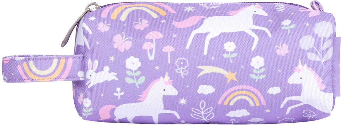 Das geräumige violette Federmäppchen mit Einhörnern und Blumen ist ideal für die Schule. Das Federmäppchen ist gefüttert und hat einen praktischen Griff zum einfachen Tragen und Aufhängen.