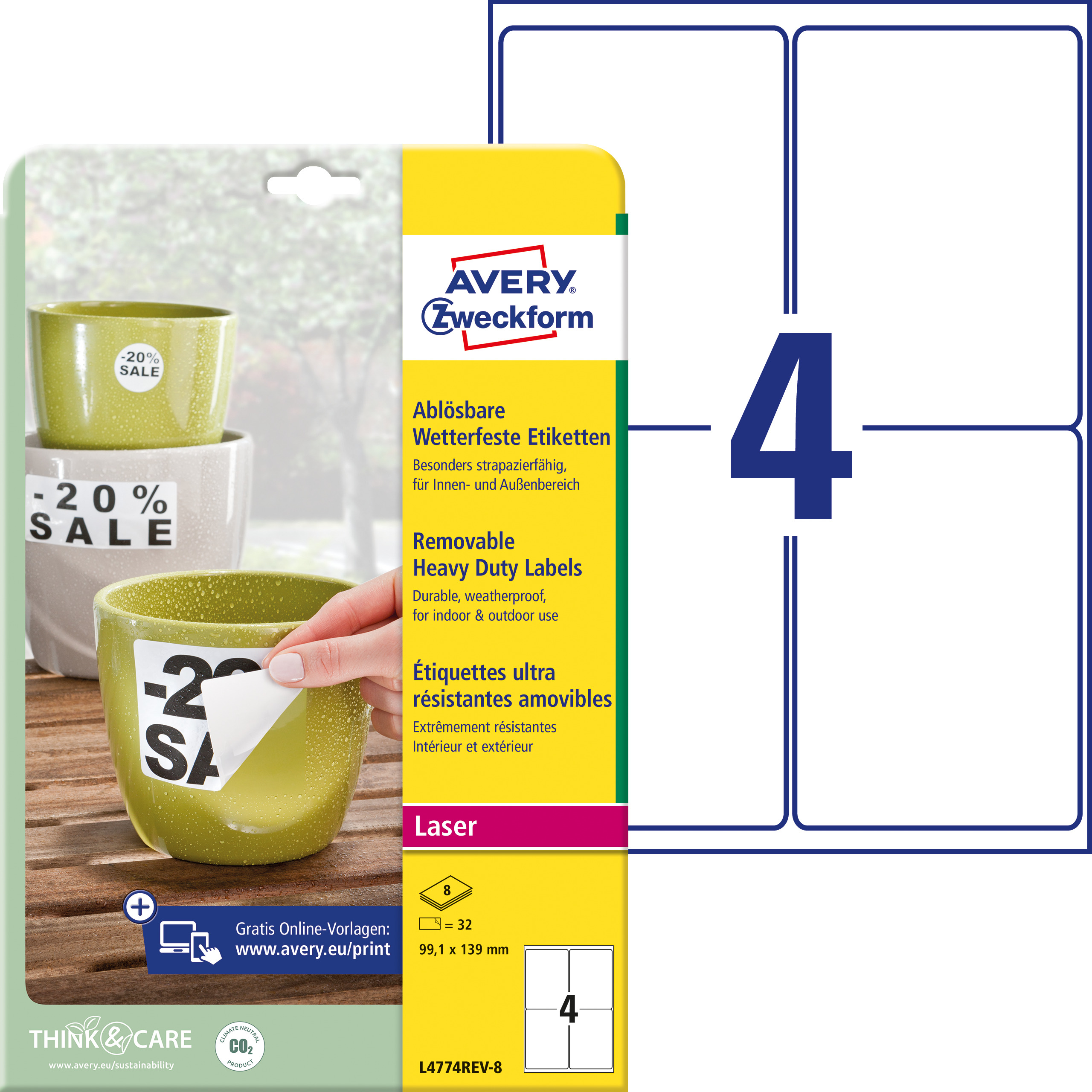 AVERY ZWECKFORM Etiketten Laser 99,1x139mm L4774REV8 weiss,wetterfest,ablösbar 8 B.