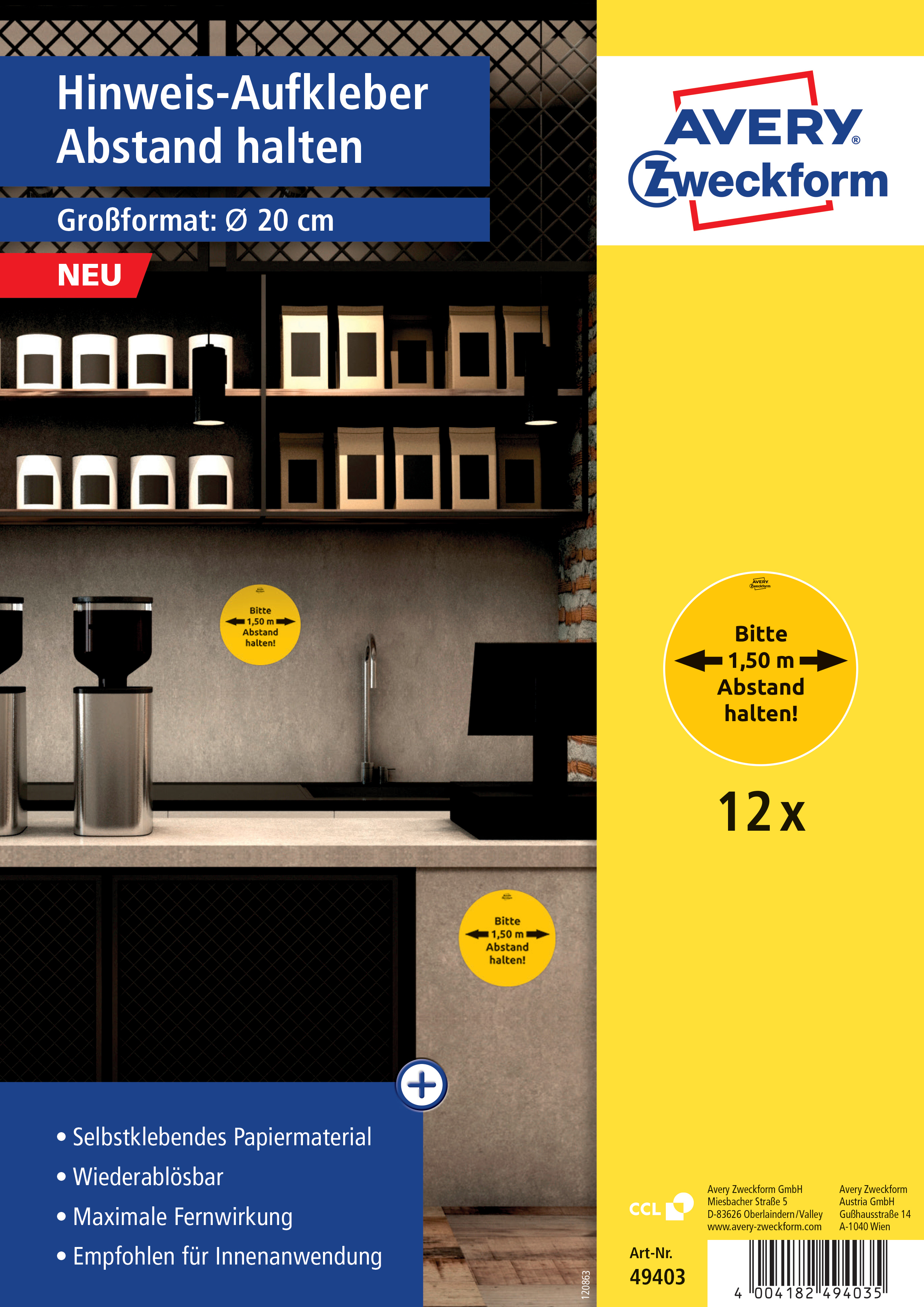 Produktinformationen "AVERY ZWECKFORM Hinweis-Aufkleber DE 20cm 49403 Abstand halten 12 Stück"