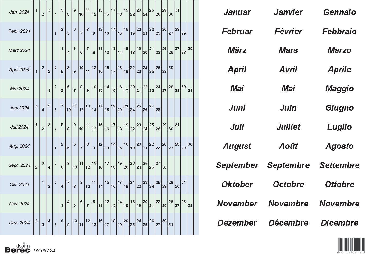 Sichern Sie sich jetzt das Datumsstreifenset von BEREC für das oder die kommenden Jahre. Es enthält kalendergerechte Datumstreifen mit farbig markierten Wochen.