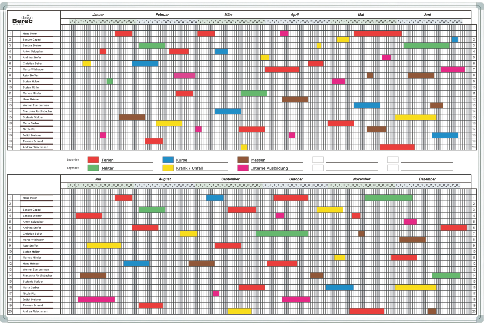 im Halbjahresformat mit einer 7-Tage-Woche-Einteilung für 20 Personen/Objekte • 2-fach-emailliert • auf die Oberfläche 25 Jahre Garantie • beschriftbar und abwaschbar • magnetisch • zweisprachig in deutsch und französisch • mit Alu-Rahmen Businessline • im Format 60 x 90 cm • Rasterung der Wochenende für eine bessere Übersicht • Lieferung inklusvie Montageset, einem Ablageboard und einem Boardmarker • Grösse der Planungsfelder: 11 x 4 mm (H x B) • Grösse der Objektspalte: 11 x 88 mm (H x B)