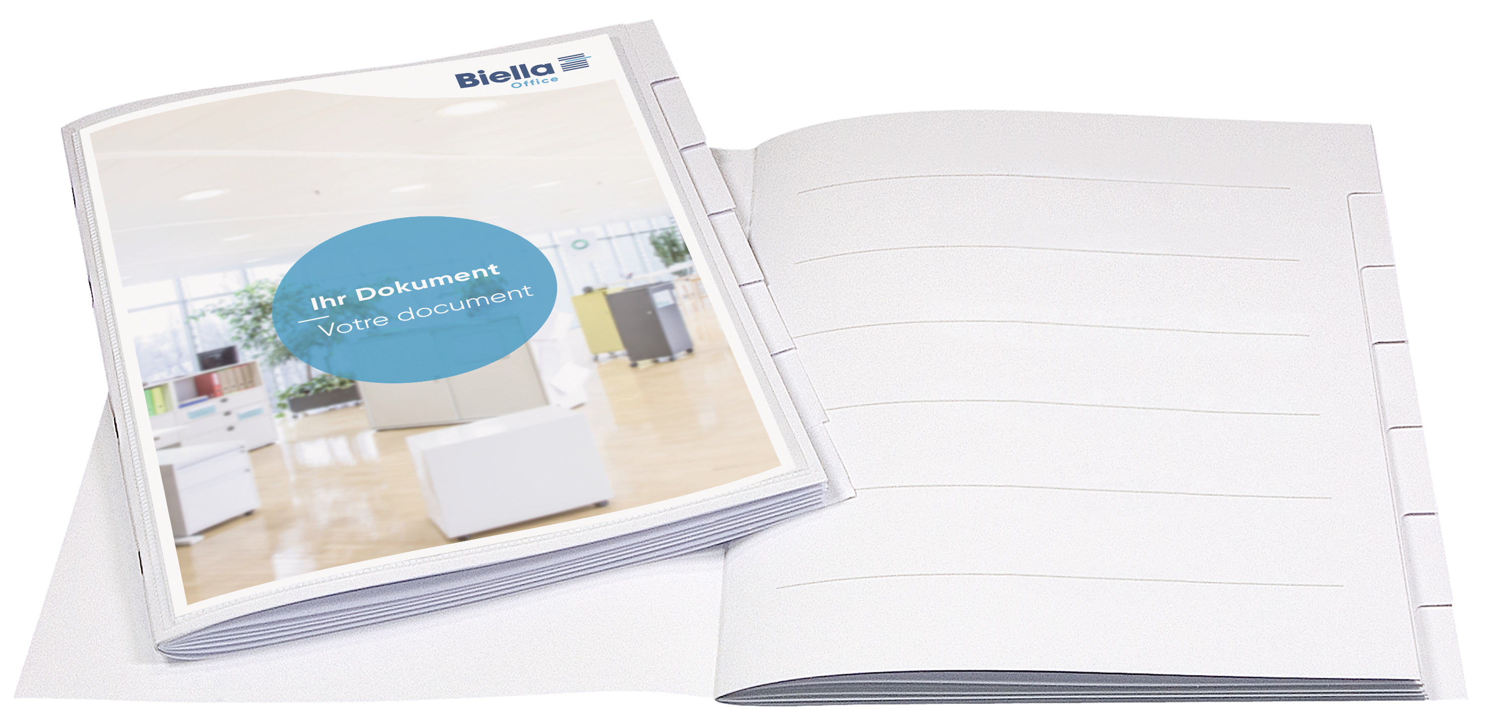 - die Sichttasche auf dem Vorderdeckel dient zur Einlage eines individuell gestalteten Deckblattes