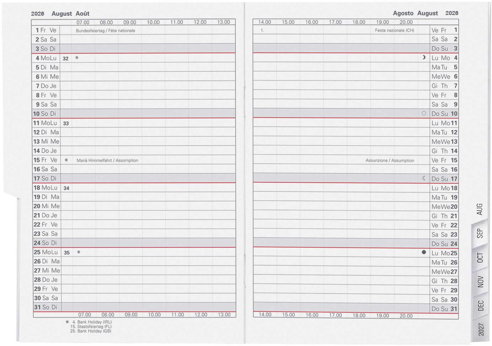 Dieses Biella Ersatzkalendarium eignet sich für den Anwender mit grosszügigerem Platzbedarf und enthält ein Kalendarium 1 Monat auf zwei Seiten und passt zum Planer Modell Glasgow.