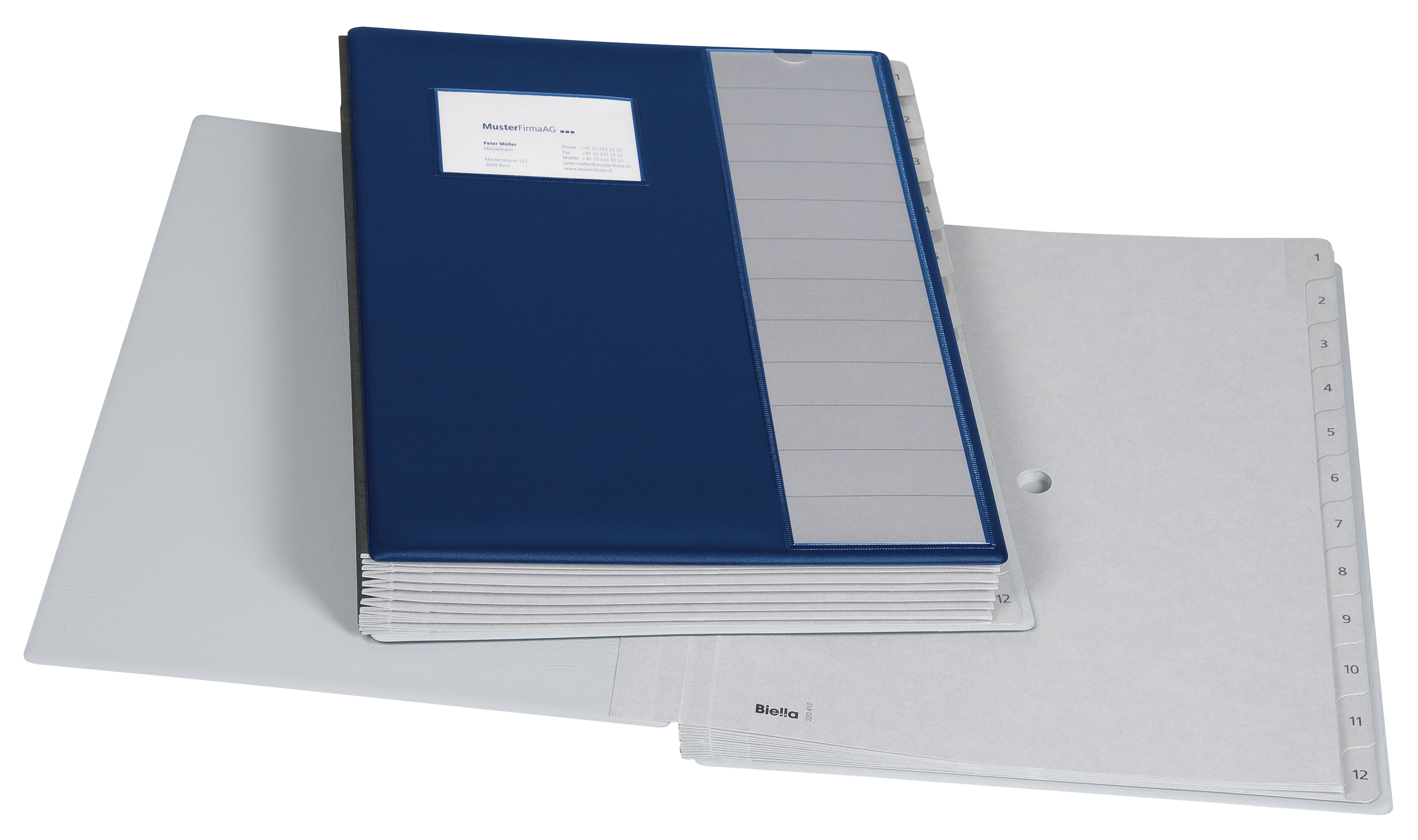 Ordnen Sie Ihre Unterlagen, Dokumente in der praktischen Pult- und Ordnungsmappe Pronto von Biella. Die Mappe wächst aufgrund des dehnbaren Rückens mit. Taben sind verstärkt - für eine besonders häufige Nutzung. Der auswechselbare Beschriftungsstreifen sowie Fenster in Visitenkartengrösse geben die Möglichkeit für die individuelle Beschriftung. Dank den Schaulöchern sind Unterlagen immer sichtbar.