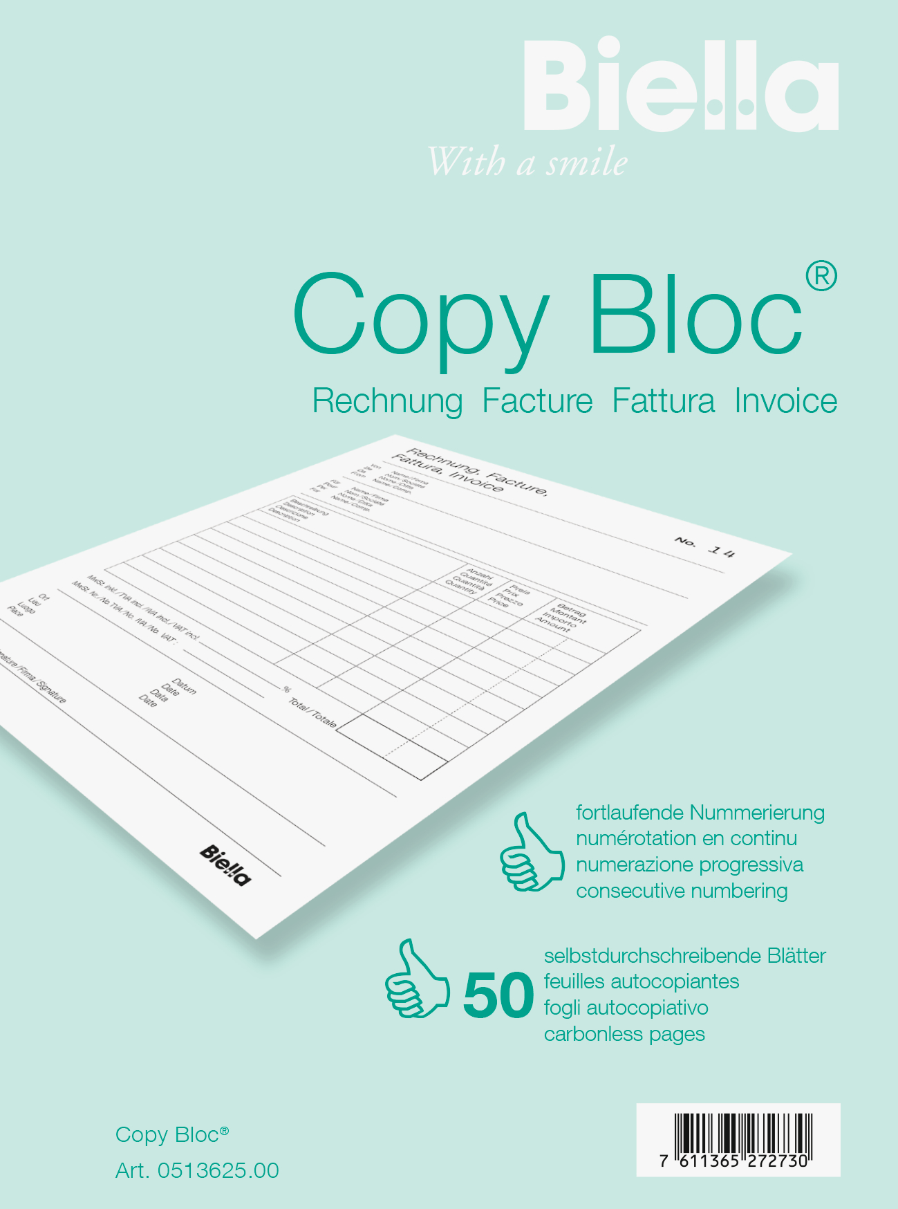 Mit dem Durchschreibeblock von Biella sind Rechnungen schnell und übersichtlich erstellt. Dank fortlaufender Nummerierung und Doppel haben Sie jederzeit ein Nachschlagewerk zur Hand.
