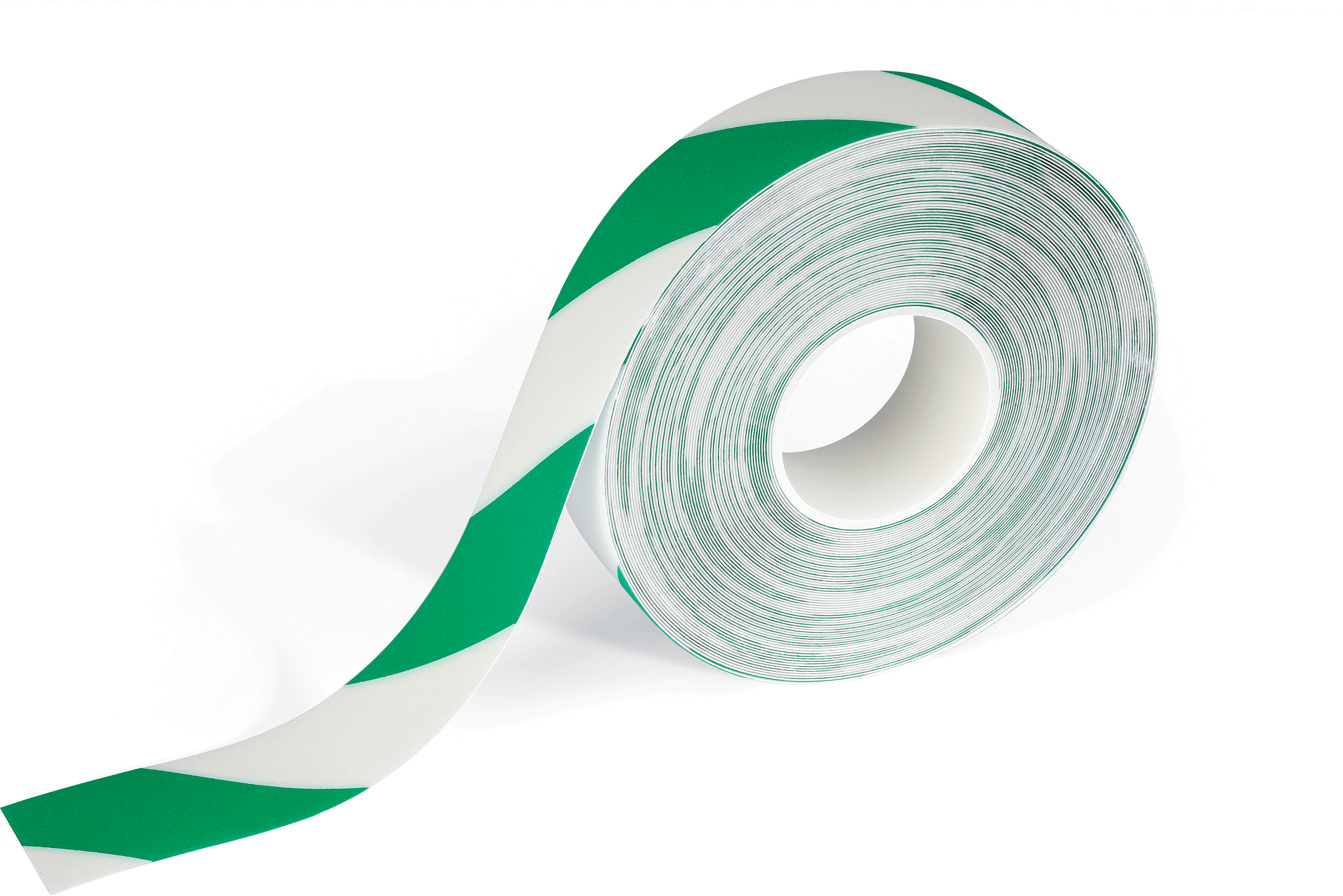 Selbstklebendes, zweifarbiges Bodenmarkierungsband für den Innenbereich, ideal für eine robuste und langfristige Kennzeichnung von Geh- und Fahrwegen in Lager und Betrieb.