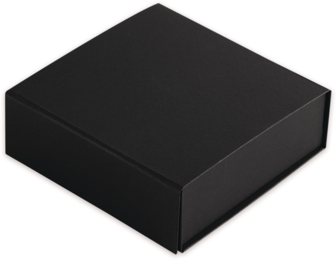 Hochwertige Geschenkbox aus schwarzem Karton (1200 g/m²). Mit Magnetverschluss. Flach angeliefert und dank Haftklebestreifen einfach aufzustellen.