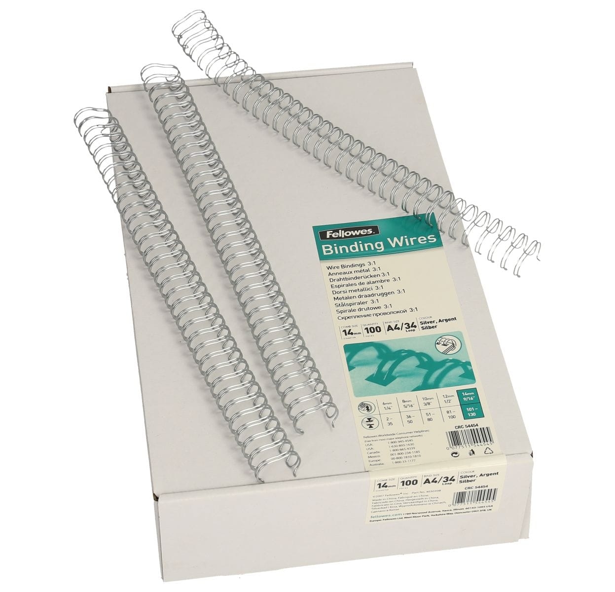 Mit Drahtbindung lassen sich Dokumente sicher und stilvoll binden • 14mm Drahtbinderücken eignen sich zum Binden von Dokumenten mit 101-120 Blatt • Inhalt: 100 Stück/Pack • Verwendbar mit allen 34 Loch Drahtbindegeräten, die bis zu 120 Blatt binden können