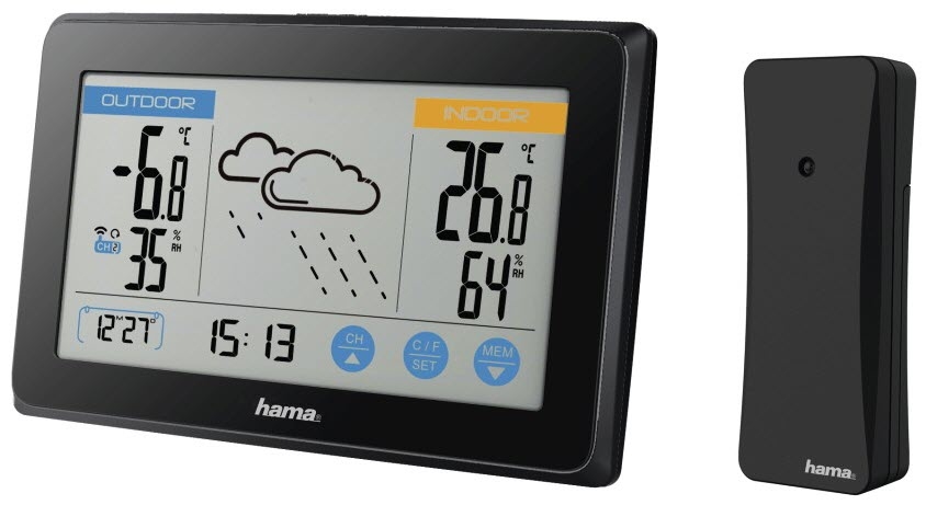 Hama Wetterstation Touch für die digitale Anzeige von Temperatur, Luftfeuchtigkeit, Uhrzeit, Datum und Wettervorhersage • Batteriekapazitätsanzeige • weisse LED-Hintergrundbeleuchtung • intuitive Bedienung mit 3 Touch-Sensoren auf dem Display • Anzeige von Innen- und Aussentemperatur - umschaltbar zwischen °C und °F • Speicherung der min./max. Werte für Temperatur • Speicherung der min./max. Werte für Luftfeuchtigkeit • Lieferumfang: Wetterstation, Sensor, 5x Batterien (AAA), Bedienungsanleitung