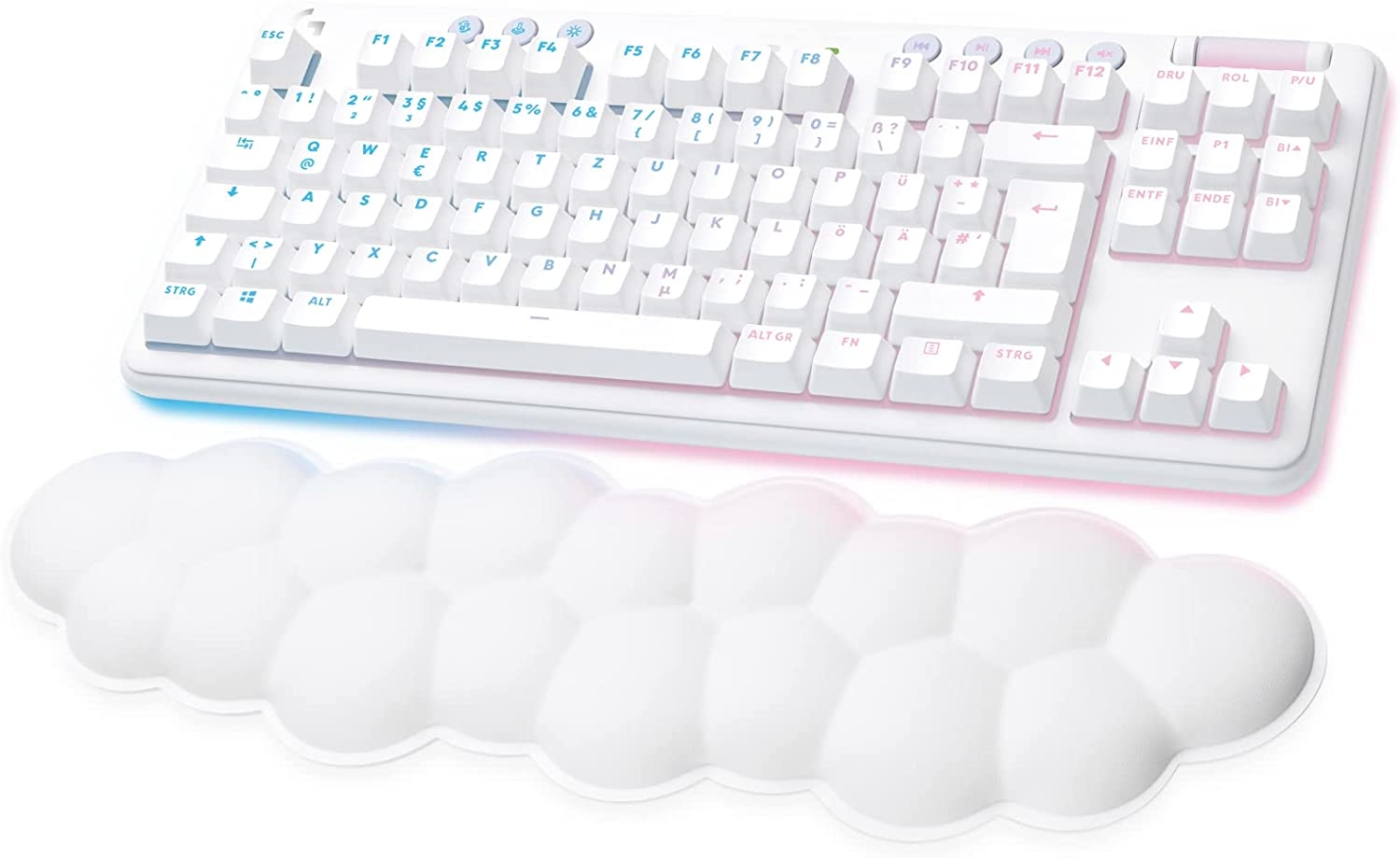 G715 aus der Aurora Collection ist eine kabellose Tastatur für Gaming-Ansprüche mit LIGHTSPEED und Bluetooth®-Verbindung, entwickelt für besonderen Komfort, weiche Handballenauflage inbegriffen. Komplett ausgestattet mit RGB-Beleuchtung und den mechanischen GX-Switches deiner Wahl. Bereitgestellt in White Mist Farbiges Zubehör ist separat erhältlich. Schwebe davon mit G715 in verträumter Ästhetik mit inbegriffener komfortabler Handballenauflage. Das kompakte Layout ohne Ziffernblock und die verstellbare Höhe sorgen für ein angenehmes Gefühl beim Spiel, den ganzen Tag. Lerne die Ausrüstung kennen, die optimal zusammenpasst und die wir mit besonderer Berücksichtigung von Komfort, Stil und Gaming-Leistung entwickelt haben. Hol dir ein komplettes, nahtloses Setup mit einer einheitlichen, verträumten Ästhetik – synchronisierter RGB-Stil inbegriffen.
